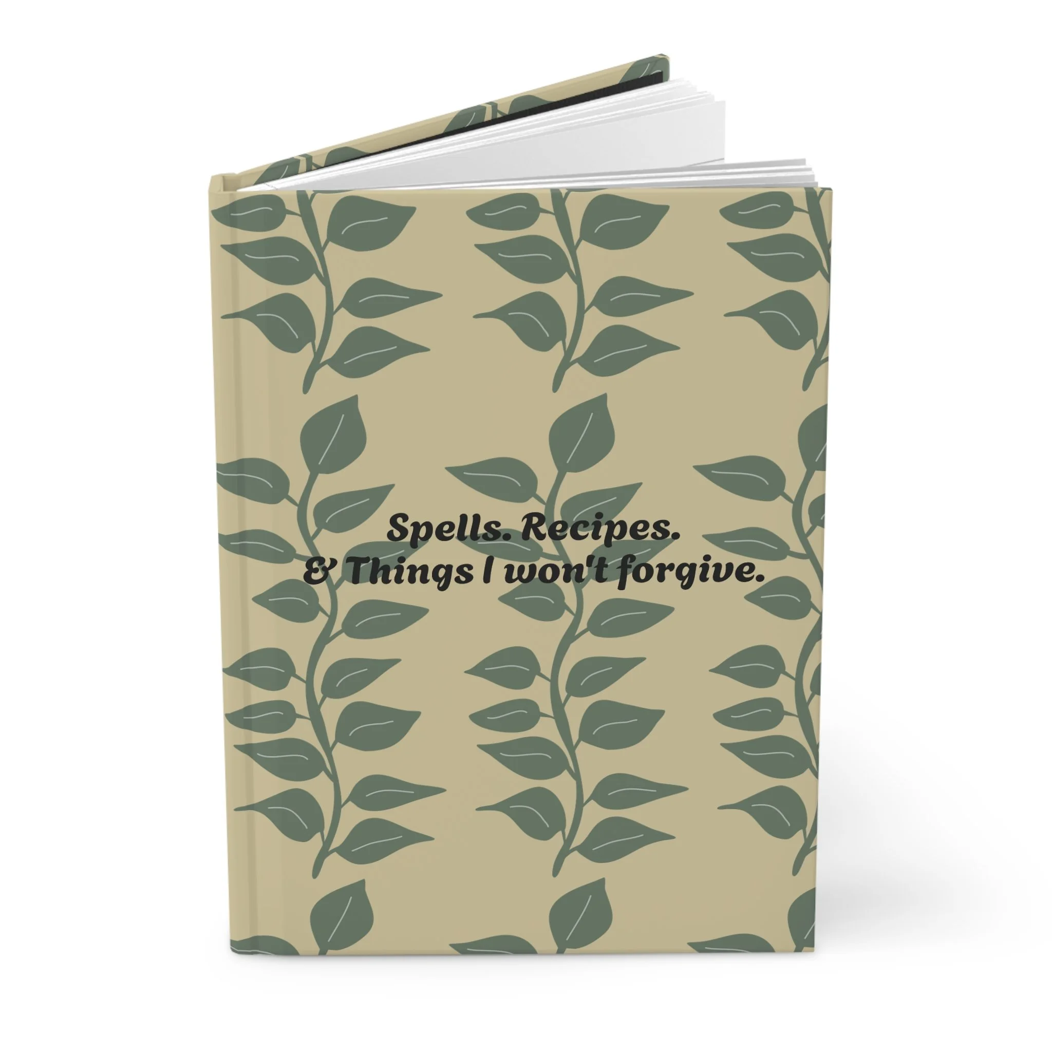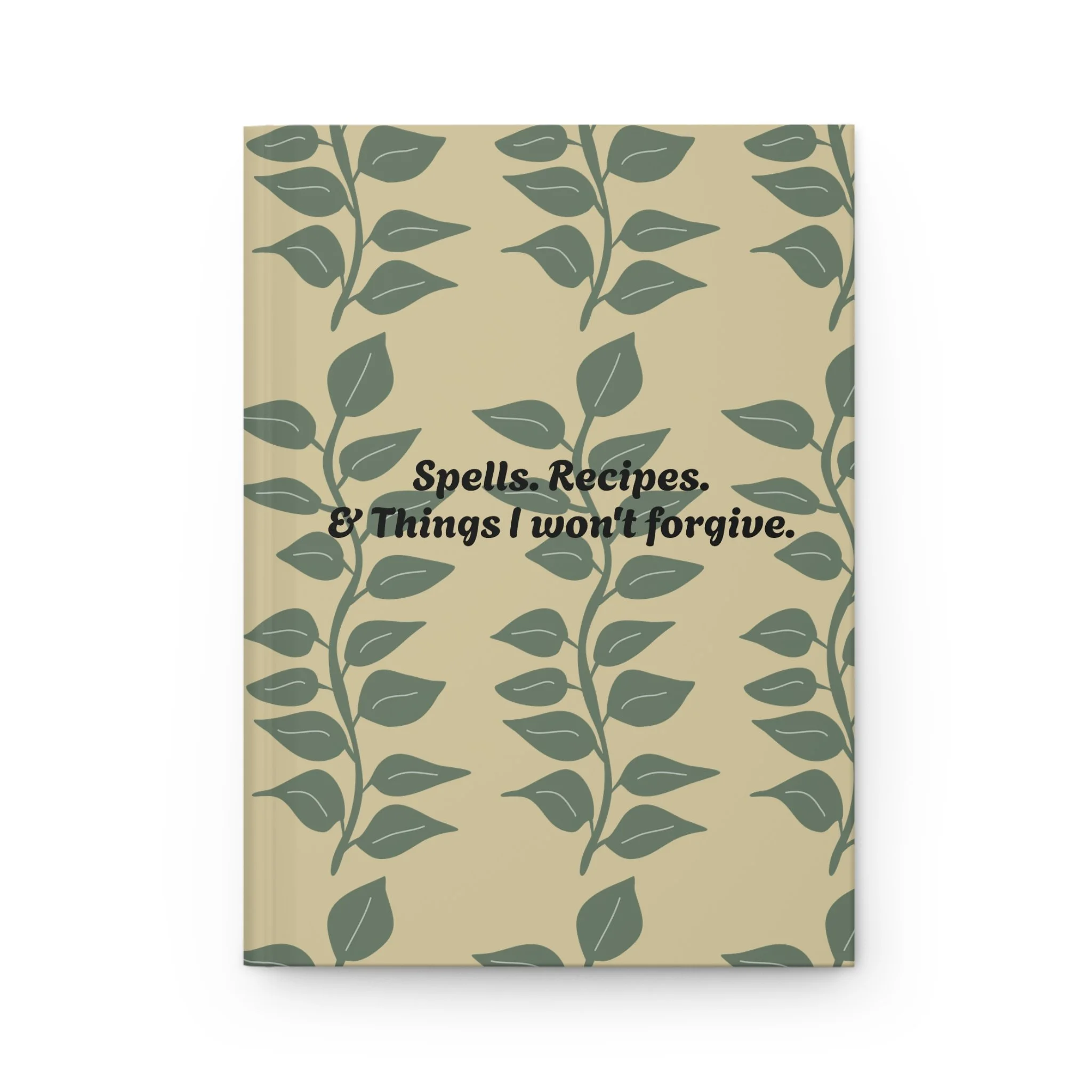 This hardcover journal brings quiet confidence to everyday note‑keeping. The matte laminated cover features an earthy vine pattern and cheeky title that reads like a private ledger—Spells, Recipes, & Things I won’t forgive—inviting you to fill pages with intentions, tried-and-true formulas, and personal notes. The sewn casewrap binding keeps the notebook flexible and lays flat for easy writing.